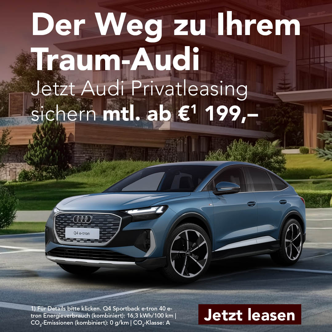 Angebote der Audi Leasing, Zweigniederlassung der Volkswagen Leasing GmbH, Gifhorner Straße 57, 38112 Braunschweig. Bonität vorausgesetzt. Gültig bis zum 31.03.2026. Abgebildete Sonderausstattungen sind im Angebot nicht unbedingt berücksichtigt. Alle Angaben basieren auf den Merkmalen des deutschen Marktes.